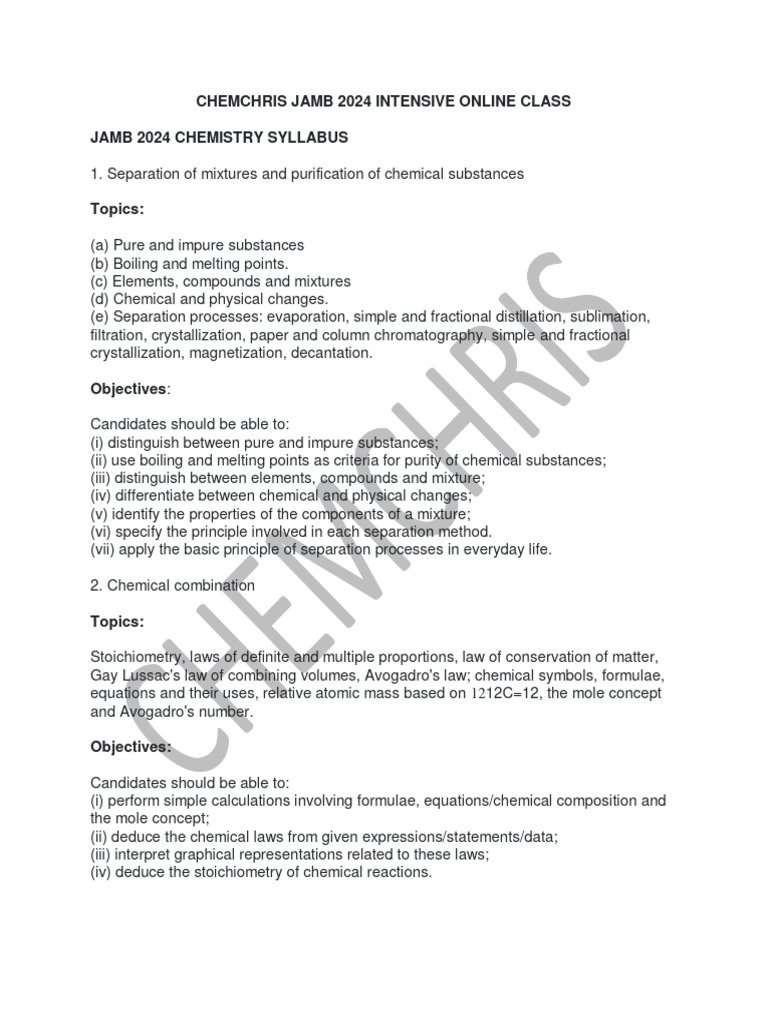 Looking for the Chemistry JAMB Syllabus for 2024? You’re in the right place. The JAMB Chemistry syllabus for 2024 is here to guide you through the key topics and concepts you need to know to excel in your upcoming exams. Understanding the syllabus is crucial for effective preparation and success. Let’s dive into the details to ensure you are fully equipped to tackle the Chemistry section of the JAMB exam with confidence.